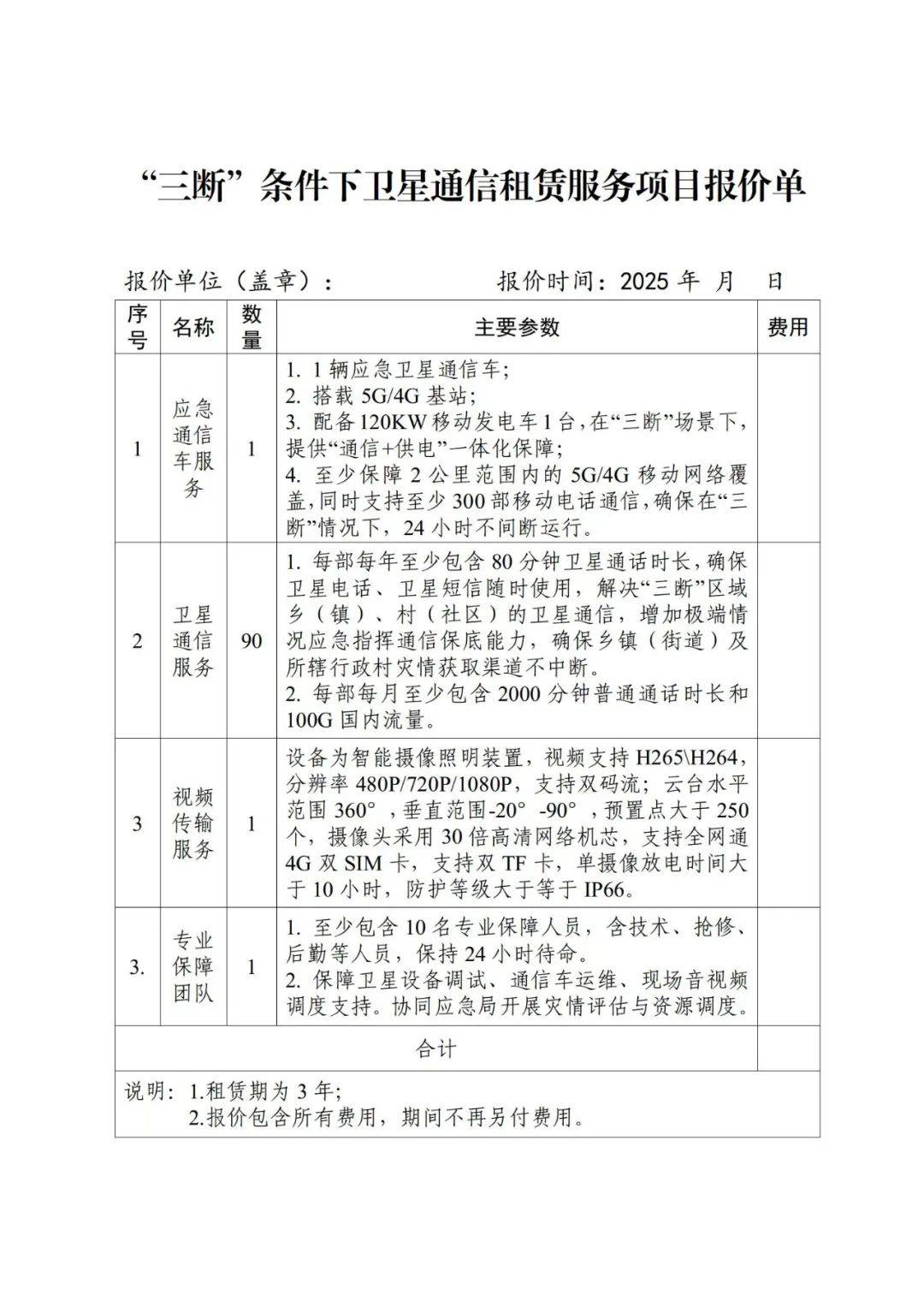 为进一步提升我市防灾减灾救灾能力,确保在应对处置洪涝等极端自然灾害时能够提供卫星通信保障服务。请自愿参与调查的各潜在服务商,根据本公告所列需求,提供相关服务项目以及具体报价。