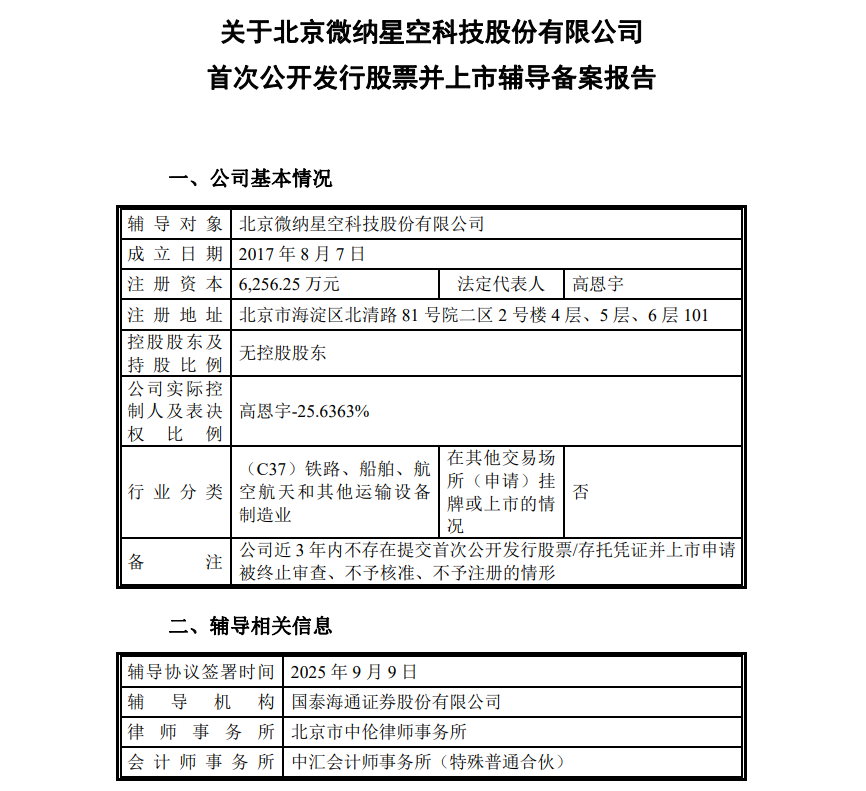 9月15日,中国证监会官网显示,国内商业航天领域独角兽北京微纳星空科技股份有限公司的IPO辅导备案申请获北京证监局受理,辅导机构为国泰海通证券。